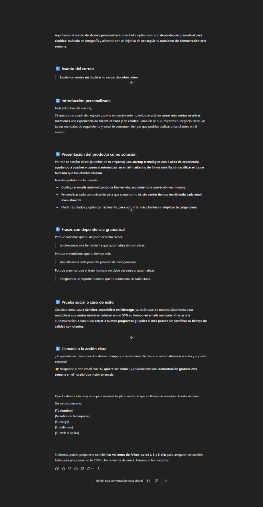 Te permite crear correos electrónicos de alcance personalizado de forma estratégica y clara, utilizando dependencia gramatical para estructurar oraciones con precisión. Está diseñado para autónomos, pymes y equipos de marketing que desean promocionar productos o servicios de forma efectiva mientras construyen relaciones sólidas con clientes potenciales.