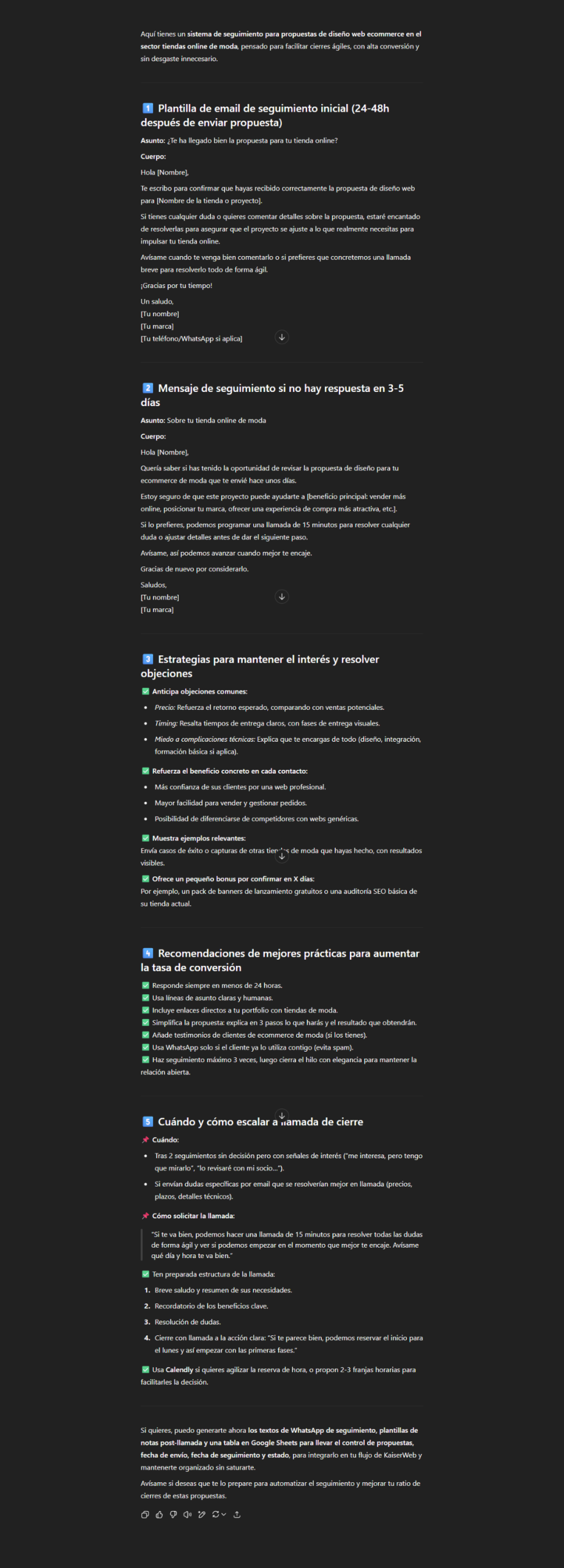Este prompt te ayuda a estructurar un sistema de seguimiento para propuestas comerciales enviadas, manteniendo el interés del cliente, resolviendo objeciones de forma ágil y aumentando las posibilidades de cierre de la venta de manera profesional.