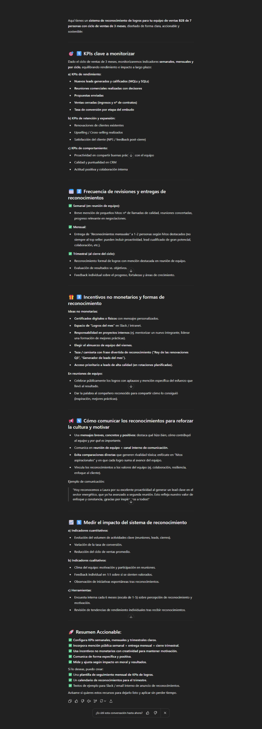 Este prompt es ideal para managers de ventas que deseen fortalecer el compromiso de sus equipos, mejorar la retención y crear una cultura de alto rendimiento mediante sistemas de reconocimiento bien estructurados.